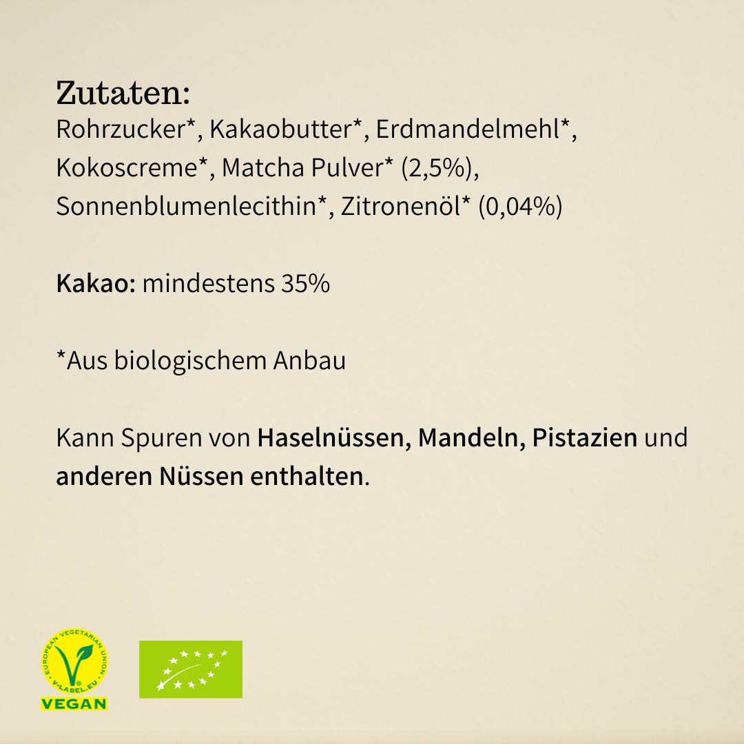 Rohrzucker*, Kakaobutter*, Erdmandelmehl*, Kokoscreme*, Matcha Pulver* (2,5%), Sonnenblumenlecithin*, Zitronenöl* (0,04%)