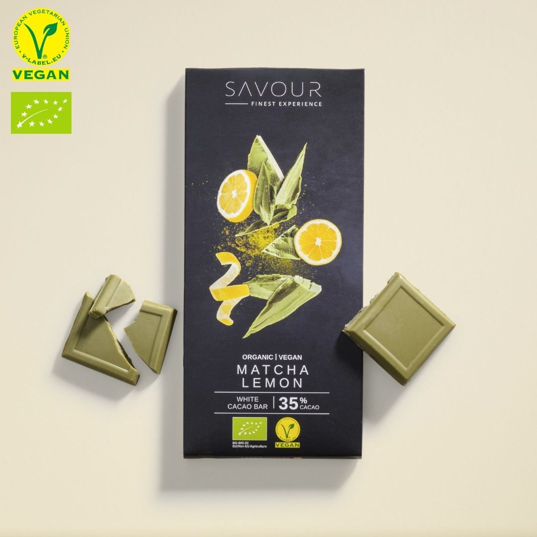 Weiße Schokolade mit Matcha & Zitrone | Bio, Vegan, Glutenfrei, ohne Palmöl, nachhaltige Verpackung